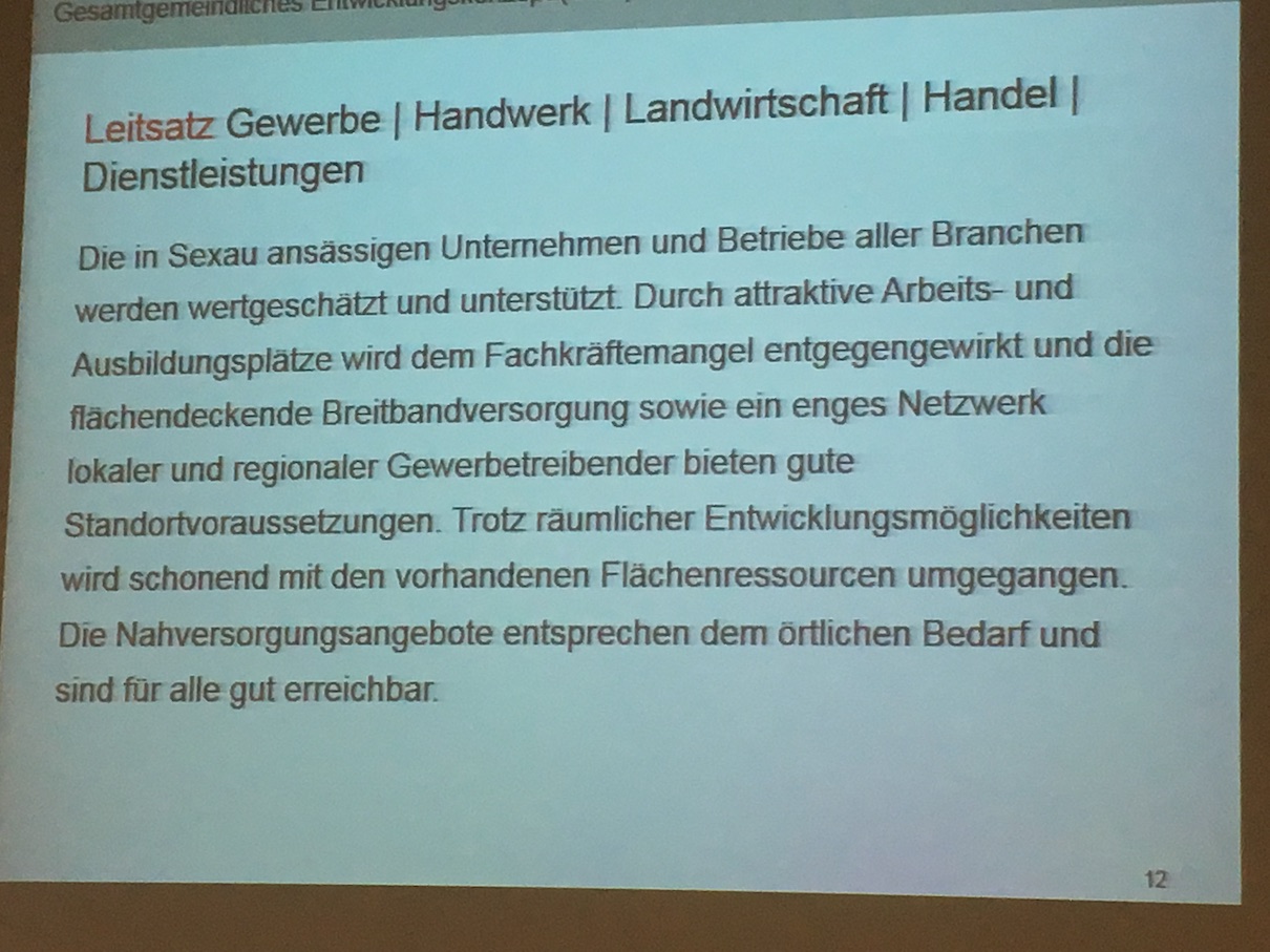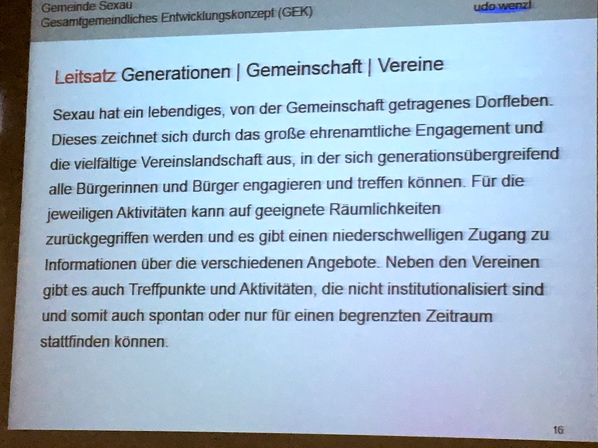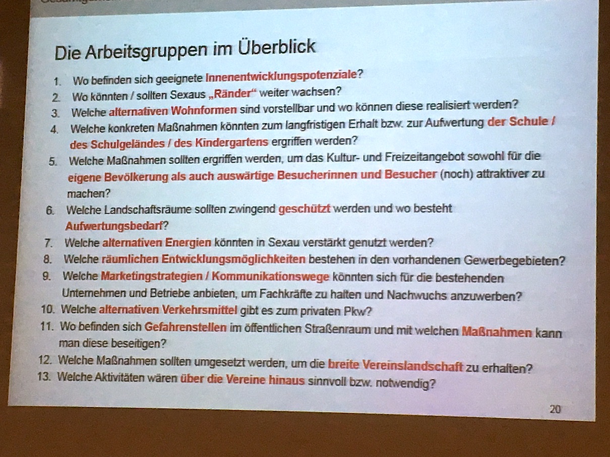 Bürgermeister Goby dankte den Anwesenden für die zahlreichen Beiträge und der Organisationsleitung für die hervorragende Arbeit. Er zeigte sich erleichtert, dass er unter den vielen Vorschlägen für die Zukunft von Sexau „keine gefunden hätte, die er nicht auch schon auf dem Schirm gehabt hätte.“