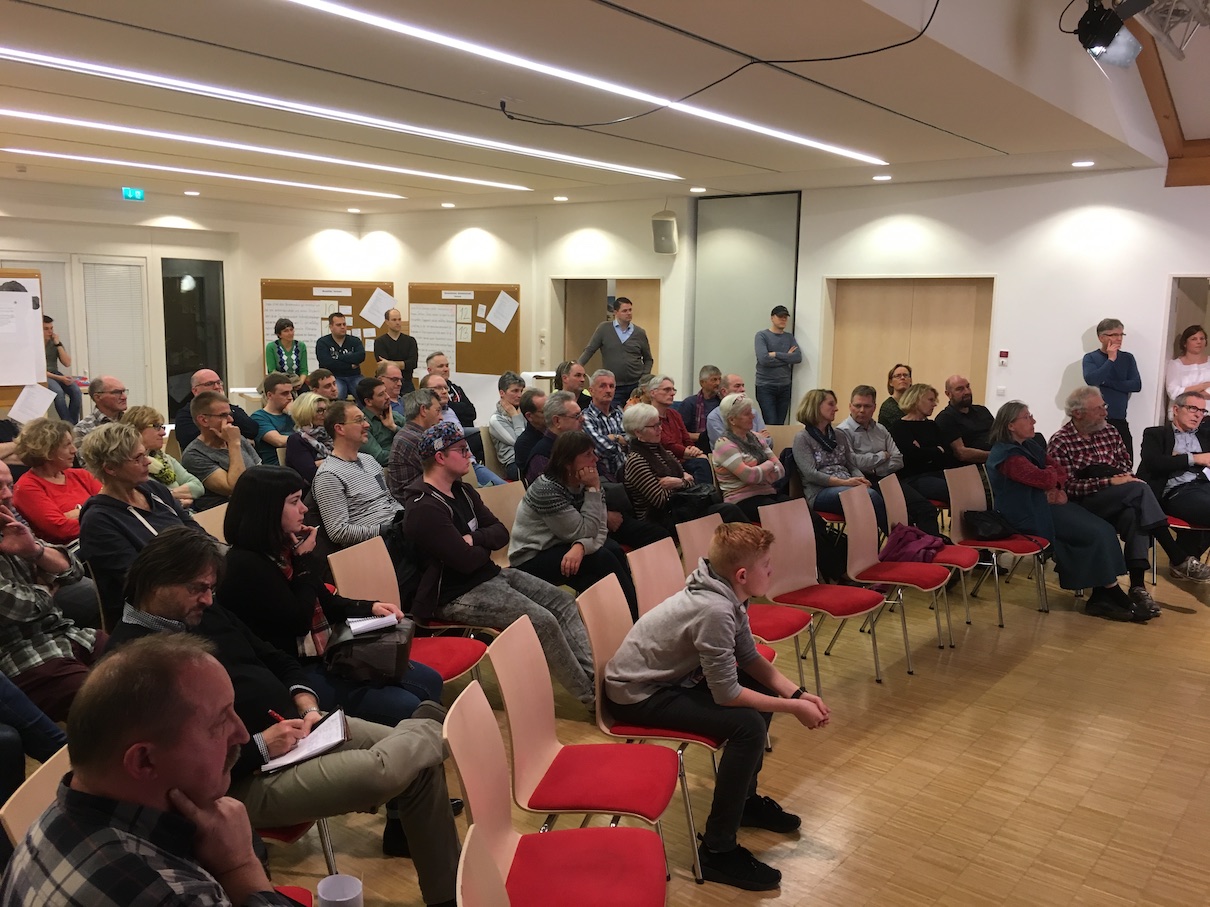 Am Freitag, den 22. Februar, fand das zweite Bürgerforum statt. Es stand zu erwarten, dass weniger Einwohner kamen, als beim ersten Forum, und so war es auch, etwa 50 Personen kamen um 17:00 Uhr in den Geschwister Roser Saal. Das Organisationsteam um Udo Wenzel hatte das Treffen, wie schon beim ersten Mal, hervorragend vorbereitet. Alle dort gemachten Vorschläge wurden in Leitsätze eingefügt, die , thematisch geordnet, an Schautafeln und später auch an der Präsentationswand gezeigt wurden. Diese Leitsätze sollten eine Vision darstellen, wie sie in Sexau 2035 verwirklicht sein könnte. Mit roten Klebepunkten konnten die Bürger die in den Leitsätzen formulierten Ziele hinsichtlich ihrer Wichtigkeit bewerten. Dann wurden zu jedem Thema Arbeitsgruppen gebildet, welche Maßnahmen erarbeiten sollten, die zur Realisierung dieser Vision beitragen könnten. Im Anschluss wurden die Ergebnisse der Arbeitsgruppe im Plenum vorgetragen. Nach dem Motto „Geht nicht – gibt’s nicht“ gab es daher ein Fülle von Vorschlägen, reichend von der Umgehungsstraße durch den Hornwaldtunnel bis hin zur Umwandlung des Baggersees in ein Naherholungsgebiet. Insbesondere die Arbeitsgruppe der Jugendlichen verblüffte wiederum durch tolle Ideen und phantasievolle Vorschläge.